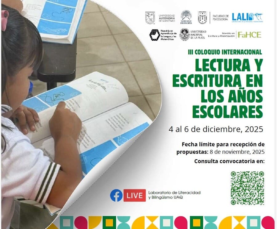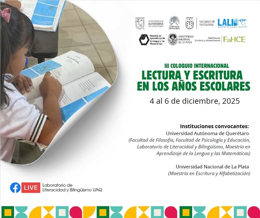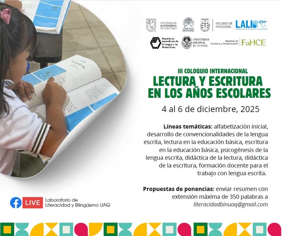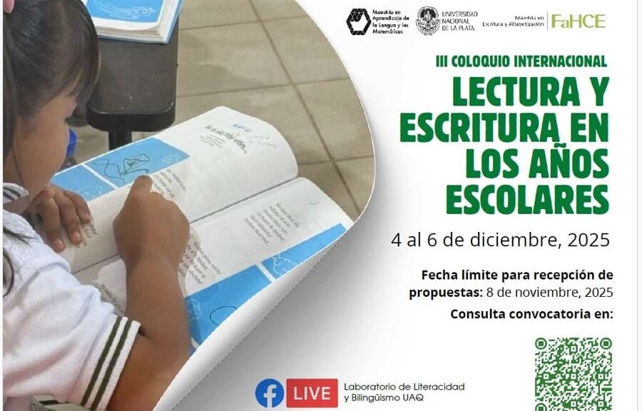 Invitación a participar como ponentes al 3er Coloquio Internacional “Lectura y escritura en los años escolares”, evento organizado por la Universidad Autónoma de Querétaro (México) y la Universidad Nacional de La Plata (Argentina), la actividad se llevará a cabo del 4 al 6 de diciembre en modalidad en línea. Consulta la convocatoria.