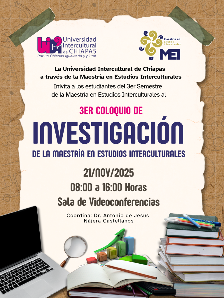 Eventos 3ER COLOQUIO DE INVESTIGACIÓN DE LA MAESTRÍA EN ESTUDIOS INTERCULTURALES noviembre 14, 2025 Difusión
