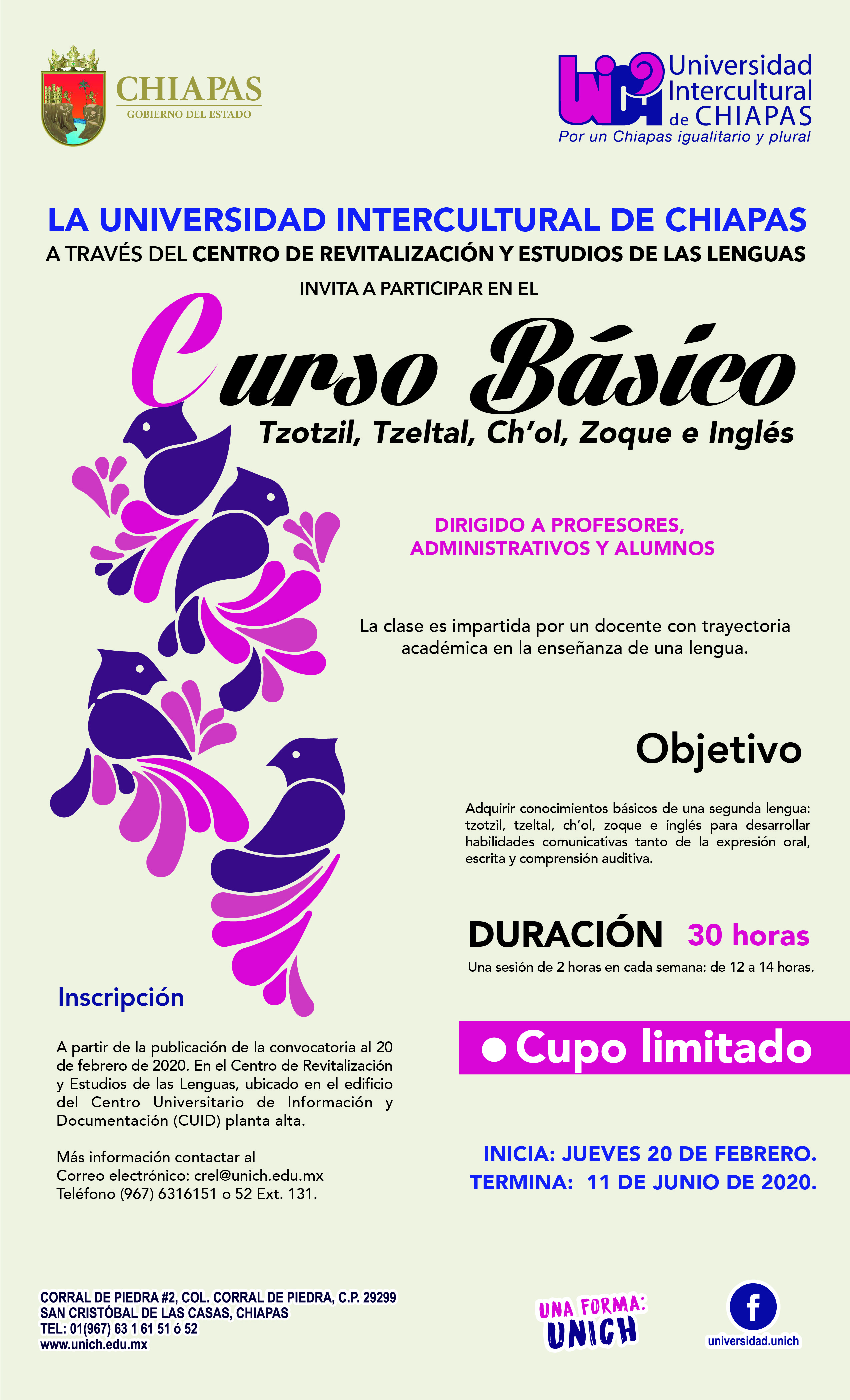 La Universidad Intercultural de Chiapas (UNICH), a través del Centro de Revitalización y Estudios de las Lenguas (CREL) invita a participar en el Curso Básico de Tzotzil, Tzeltal, Ch´ol, Zoque e Ingles. Cupo limitado Cursos Dirigido a Profesores, Administrativos y Alumnos