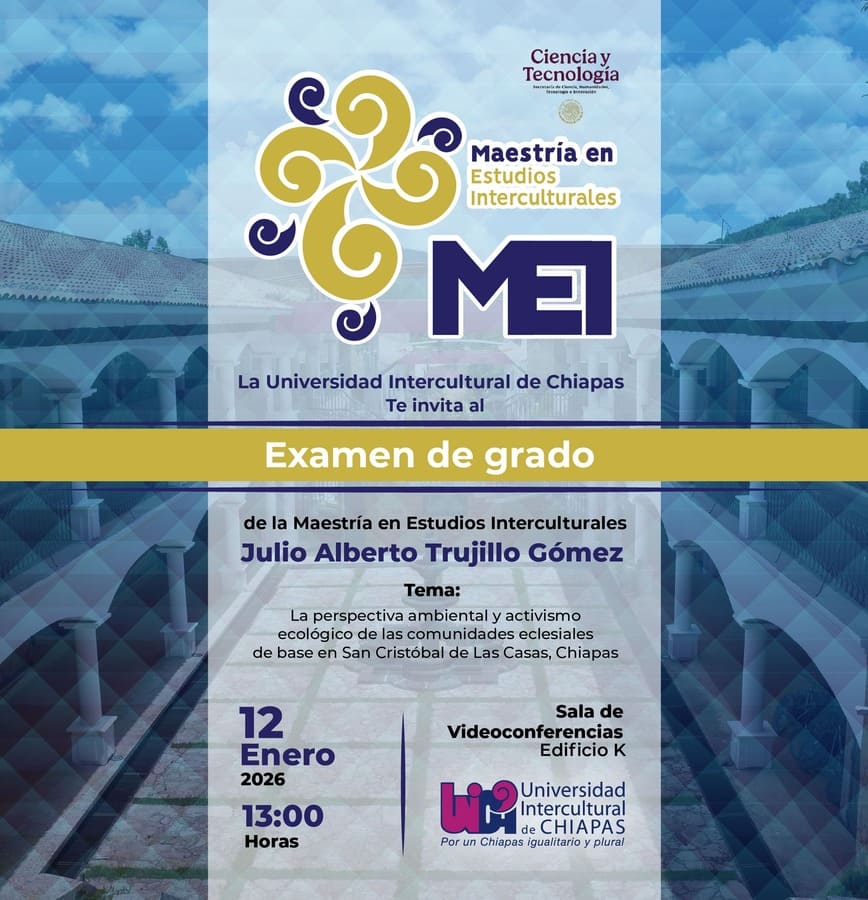 Académicas La Universidad Intercultural de Chiapas te invita al examen de grado de Julio Alberto Trujillo Gómez enero 9, 2026 Difusión Con el tema: la perspectiva ambiental y activismo ecológico de las comunidades eclesiales de base en San Cristóbal de Las Casas, Chiapas.