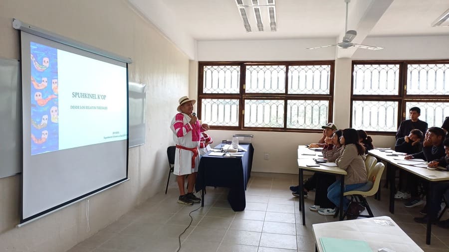 Hoy 24 de septiembre de 2025, en la UNICH, sede de Oxchuc, en colaboración con la casa de la cultura de Oxchuc, se llevó a cabo la presentación del libro titulado SPUHKINEL K’OP del Autor Armando Palé; contando con la presencia del Mtro. Xun Betan escritor tsotsil quien dio su opinión acerca del libro hacia jóvenes estudiantes de la Licenciatura en Lengua y Cultura de esta casa de estudios, moderó la presentación el Lic. Julio Cesar López Gómez, docente de la academia de lengua y cultura.