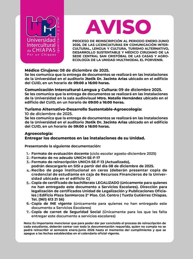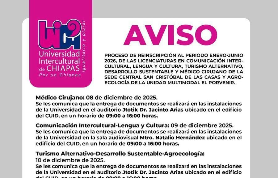 Comunicados Proceso de Reinscripción San Cristóbal de Las Casas y El Porvenir diciembre 2, 2025 Difusión