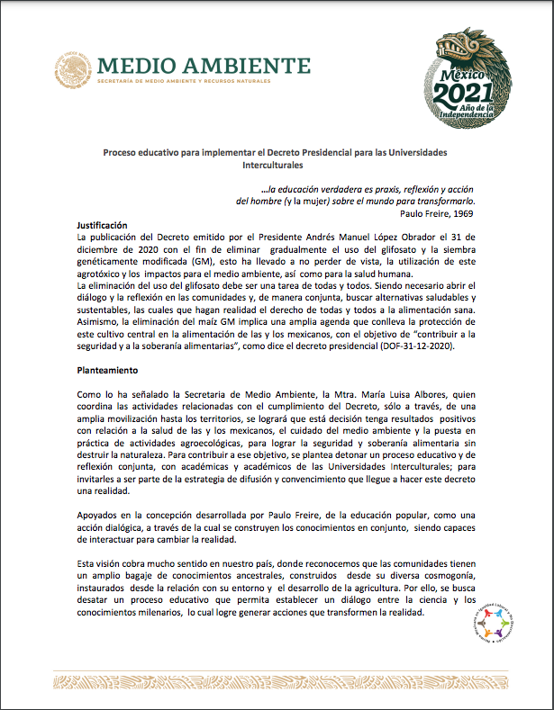 Convocatorias Proceso educativo para implementar el Decreto Presidencial para las Universidades Interculturales mayo 24, 2021 Difusión Curso SEMARNATDescarga